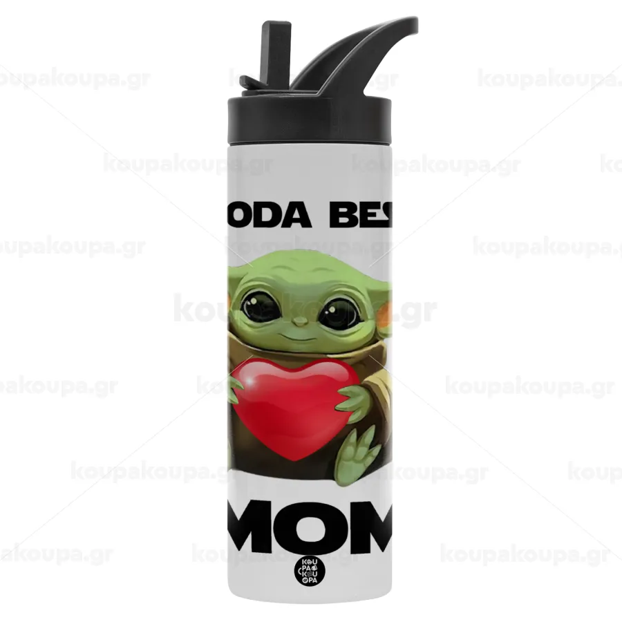 Yoda Best mom, Metallic thermos bottle with straw & handle, stainless steel (Stainless steel 304), double-walled, 600ml.
