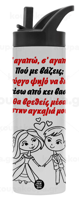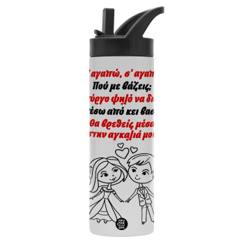 Σ΄ αγαπώ σ΄ αγαπώ που με βάζεις, Metallic thermos bottle with straw & handle, stainless steel (Stainless steel 304), double-walled, 600ml.