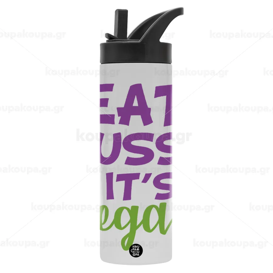 EAT pussy it's vegan, Metallic thermos bottle with straw & handle, stainless steel (Stainless steel 304), double-walled, 600ml.
