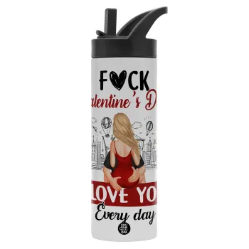 I love You Everyday , Metallic thermos bottle with straw & handle, stainless steel (Stainless steel 304), double-walled, 600ml.