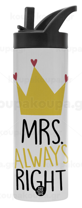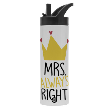Mrs "Always" right, Metallic thermos bottle with straw & handle, stainless steel (Stainless steel 304), double-walled, 600ml.