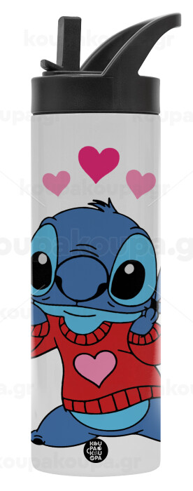 Stitch heart, Metallic thermos bottle with straw & handle, stainless steel (Stainless steel 304), double-walled, 600ml.