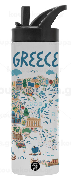 Greek map, Metallic thermos bottle with straw & handle, stainless steel (Stainless steel 304), double-walled, 600ml.