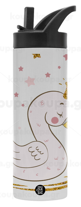 Crowned swan, Metallic thermos bottle with straw & handle, stainless steel (Stainless steel 304), double-walled, 600ml.
