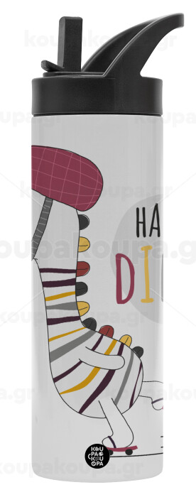 Happy Dino, Metallic thermos bottle with straw & handle, stainless steel (Stainless steel 304), double-walled, 600ml.
