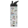 Unicorn pattern, Metallic thermos bottle with straw & handle, stainless steel (Stainless steel 304), double-walled, 600ml.