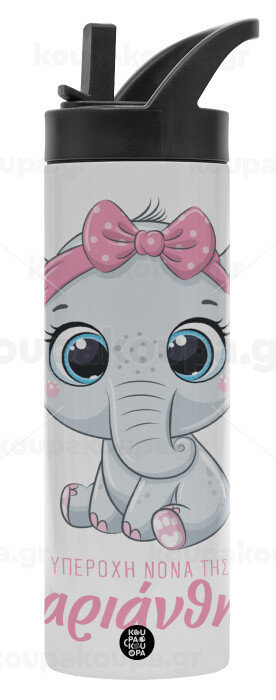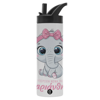 Η νονά μου, ελεφαντάκι ροζ, Metallic thermos bottle with straw & handle, stainless steel (Stainless steel 304), double-walled, 600ml.