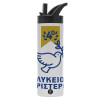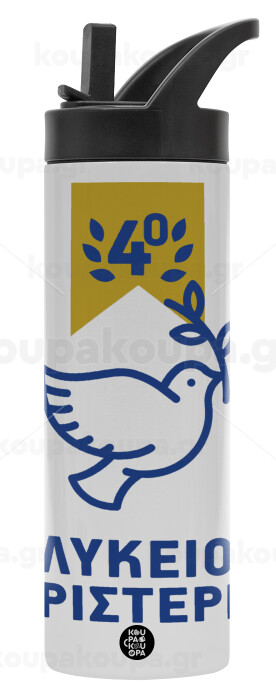 Έμβλημα Σχολικό μπλε/χρυσό περιστέρι, Metallic thermos bottle with straw & handle, stainless steel (Stainless steel 304), double-walled, 600ml.