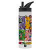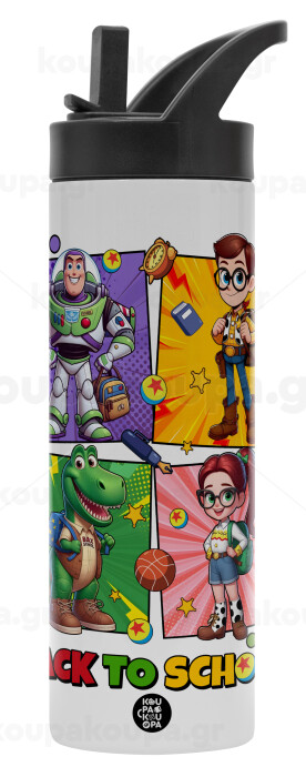 Back to the School Buzz & Friends, Metallic thermos bottle with straw & handle, stainless steel (Stainless steel 304), double-walled, 600ml.