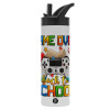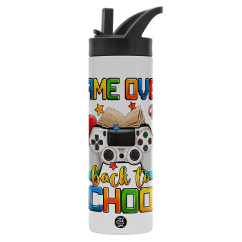 GAME OVER, Back to the School, Metallic thermos bottle with straw & handle, stainless steel (Stainless steel 304), double-walled, 600ml.