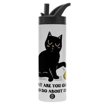 CAT, what are you going to do about it!, Metallic thermos bottle with straw & handle, stainless steel (Stainless steel 304), double-walled, 600ml.