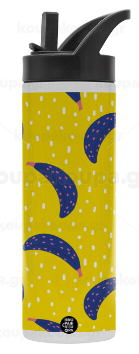 Yellow seamless with blue bananas, Metallic thermos bottle with straw & handle, stainless steel (Stainless steel 304), double-walled, 600ml.