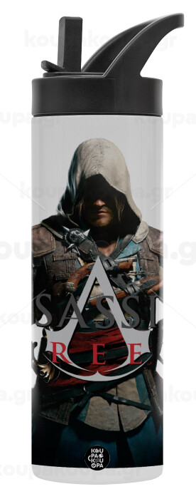 Assassin's Creed, Metallic thermos bottle with straw & handle, stainless steel (Stainless steel 304), double-walled, 600ml.