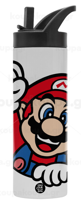 Super mario win, Metallic thermos bottle with straw & handle, stainless steel (Stainless steel 304), double-walled, 600ml.