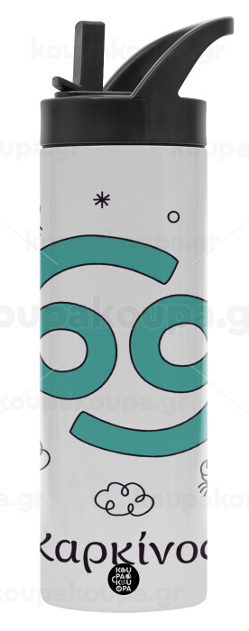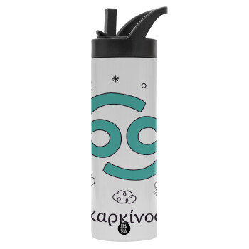 Ζώδια Καρκίνος, Metallic thermos bottle with straw & handle, stainless steel (Stainless steel 304), double-walled, 600ml.