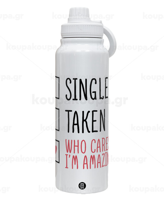 Single, Taken, Who cares i'm amazing, 1L Stainless Steel Thermal Bottle with Phone Holder & Double Wall Insulation