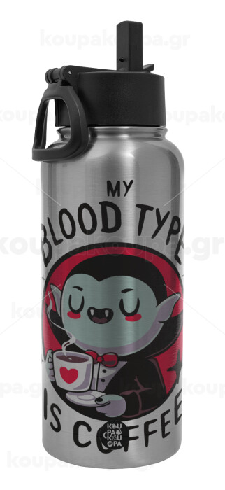 My blood type is coffee, Metal mug thermo Silver with Straw and Spout Lid (Stainless steel), double wall, 950ml