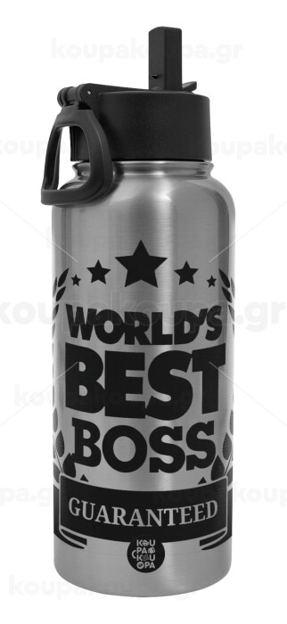 World's best boss stars, Metal mug thermo Silver with Straw and Spout Lid (Stainless steel), double wall, 950ml