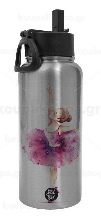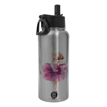 Ballerina watercolor, Metal mug thermo Silver with Straw and Spout Lid (Stainless steel), double wall, 950ml