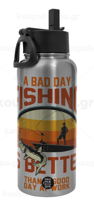 A bad day FISHING is better than a good day at work, Metal mug thermo Silver with Straw and Spout Lid (Stainless steel), double wall, 950ml