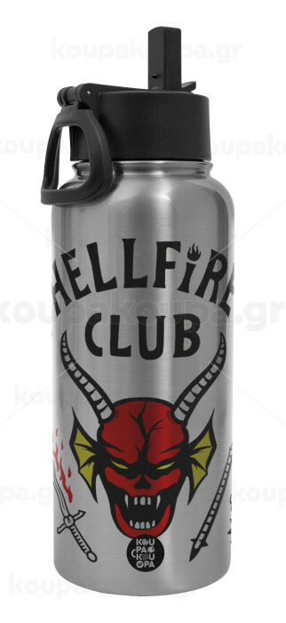 Hellfire CLub, Stranger Things, Metal mug thermo Silver with Straw and Spout Lid (Stainless steel), double wall, 950ml
