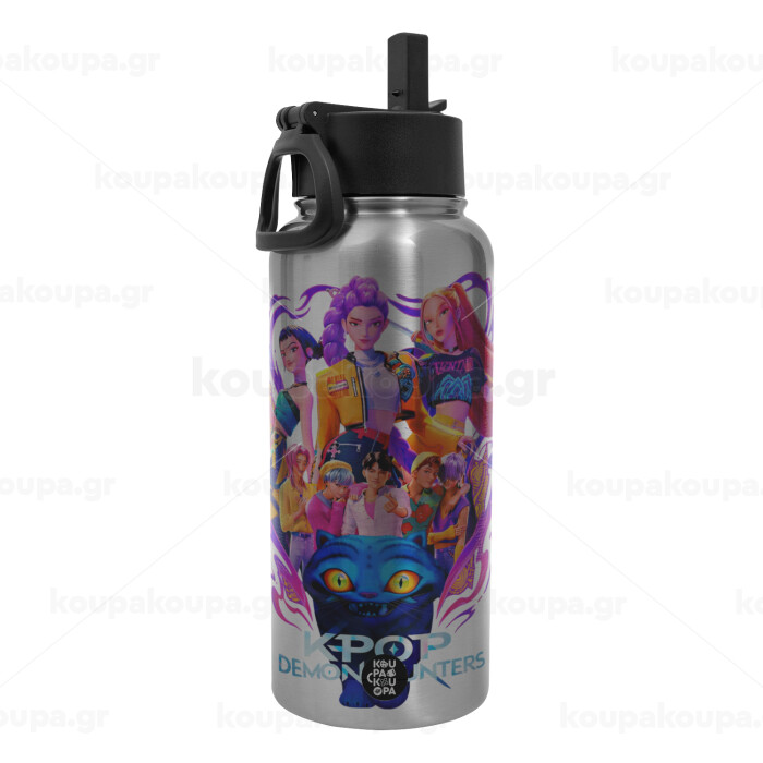 kpop Demon Hunters Huntrix, Metal mug thermo Silver with Straw and Spout Lid (Stainless steel), double wall, 950ml