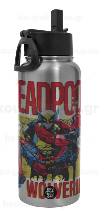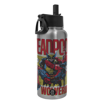 Superhero Deadpool Wolverine, Metal mug thermo Silver with Straw and Spout Lid (Stainless steel), double wall, 950ml