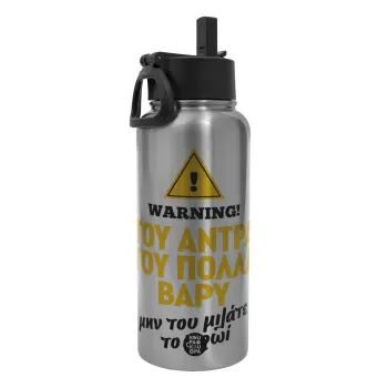Του άντρα του πολλά βαρύ, Metal mug thermo Silver with Straw and Spout Lid (Stainless steel), double wall, 950ml