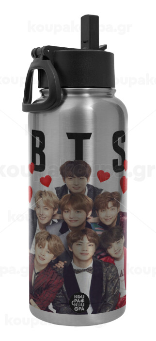 BTS hearts, Metal mug thermo Silver with Straw and Spout Lid (Stainless steel), double wall, 950ml