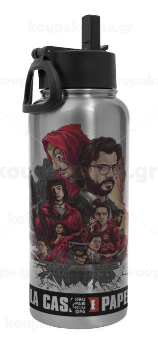 La casa de papel drawing cover, Metal mug thermo Silver with Straw and Spout Lid (Stainless steel), double wall, 950ml