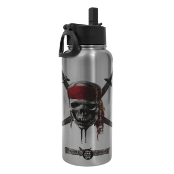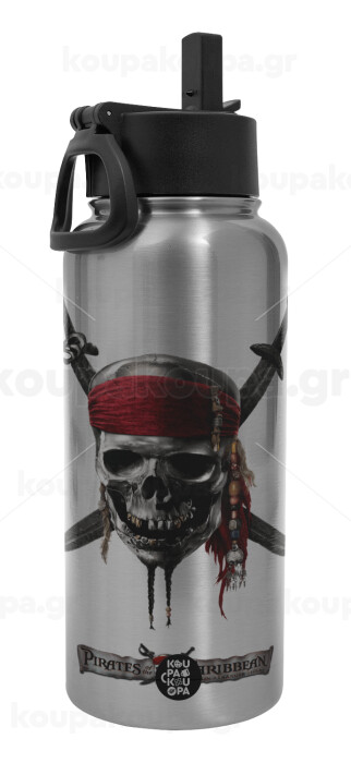 Pirates of the Caribbean, Metal mug thermo Silver with Straw and Spout Lid (Stainless steel), double wall, 950ml