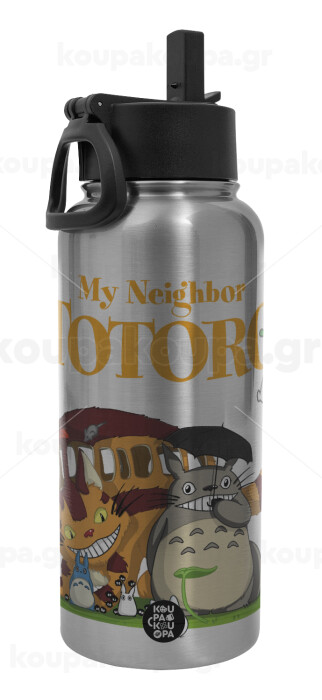 Totoro and Cat, Metal mug thermo Silver with Straw and Spout Lid (Stainless steel), double wall, 950ml