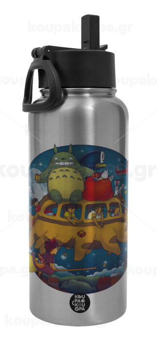 Totoro Catbus, Metal mug thermo Silver with Straw and Spout Lid (Stainless steel), double wall, 950ml