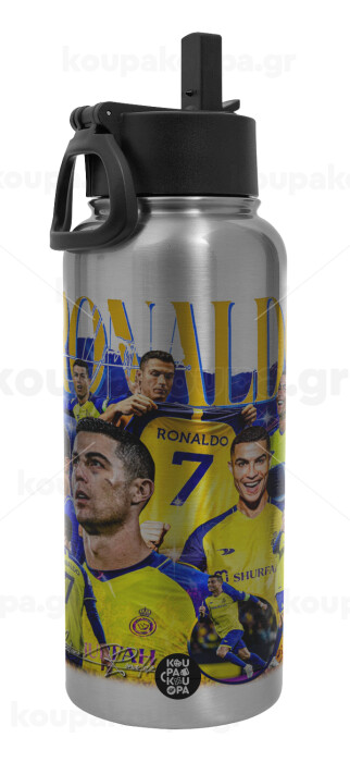 Cristiano Ronaldo Al Nassr, Metal mug thermo Silver with Straw and Spout Lid (Stainless steel), double wall, 950ml