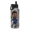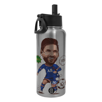 Lionel Messi drawing, Metal mug thermo Silver with Straw and Spout Lid (Stainless steel), double wall, 950ml