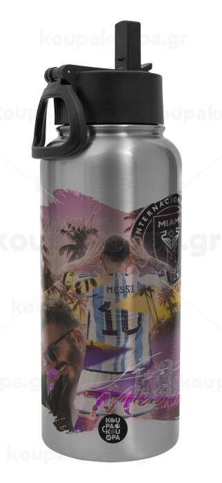 Lionel Messi Miami, Metal mug thermo Silver with Straw and Spout Lid (Stainless steel), double wall, 950ml