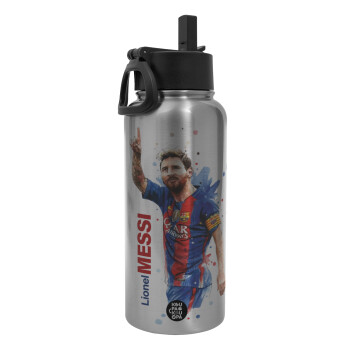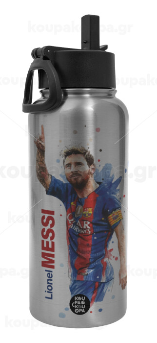 Lionel Messi, Metal mug thermo Silver with Straw and Spout Lid (Stainless steel), double wall, 950ml
