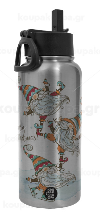 Christmas nordic gnomes, Metal mug thermo Silver with Straw and Spout Lid (Stainless steel), double wall, 950ml