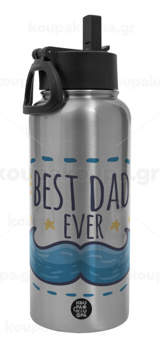 Best dad ever μπλε μουστάκι, Metal mug thermo Silver with Straw and Spout Lid (Stainless steel), double wall, 950ml