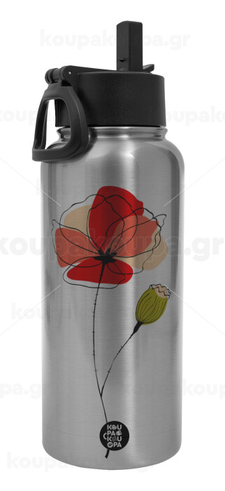 Red poppy flowers papaver, Metal mug thermo Silver with Straw and Spout Lid (Stainless steel), double wall, 950ml
