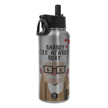 Παππού σε αγαπώ πολύ!, Metal mug thermo Silver with Straw and Spout Lid (Stainless steel), double wall, 950ml