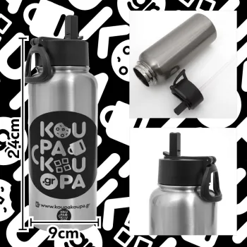 Στην SUPER μαμά μου, comic, Metal mug thermo Silver with Straw and Spout Lid (Stainless steel), double wall, 950ml