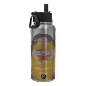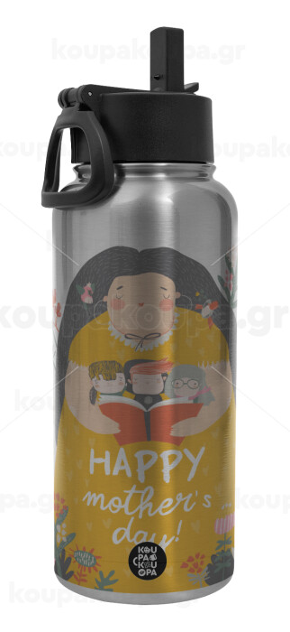 Cute mother reading book, happy mothers day, Metal mug thermo Silver with Straw and Spout Lid (Stainless steel), double wall, 950ml