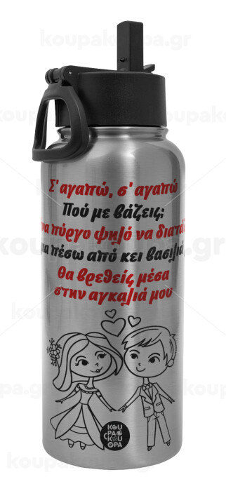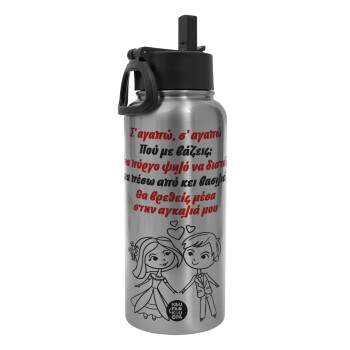 Σ΄ αγαπώ σ΄ αγαπώ που με βάζεις, Metal mug thermo Silver with Straw and Spout Lid (Stainless steel), double wall, 950ml