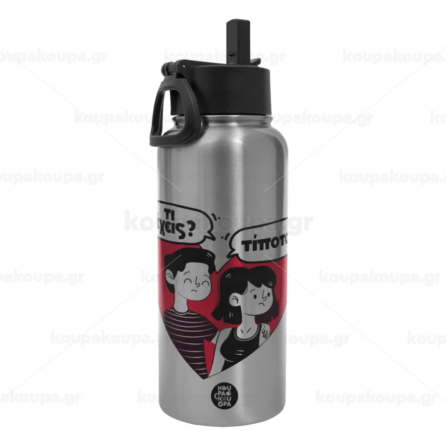 Τι έχεις? Τίποτα!, Metal mug thermo Silver with Straw and Spout Lid (Stainless steel), double wall, 950ml