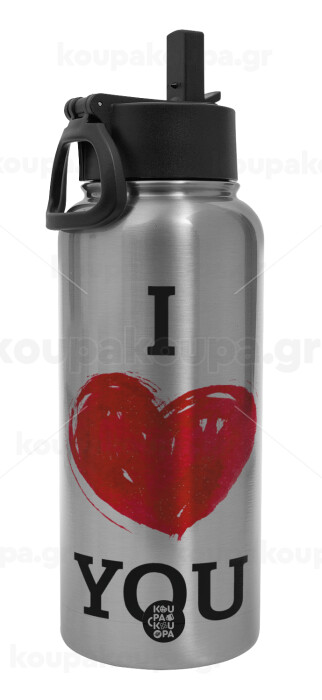 I Love You, Metal mug thermo Silver with Straw and Spout Lid (Stainless steel), double wall, 950ml
