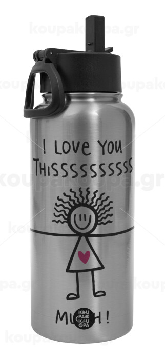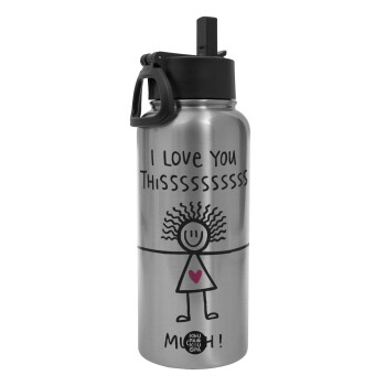 I Love you thissss much..., Metal mug thermo Silver with Straw and Spout Lid (Stainless steel), double wall, 950ml