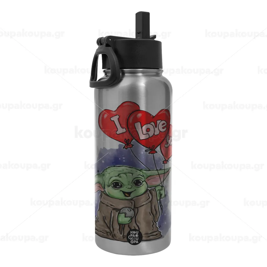 Yoda, i love you, Metal mug thermo Silver with Straw and Spout Lid (Stainless steel), double wall, 950ml