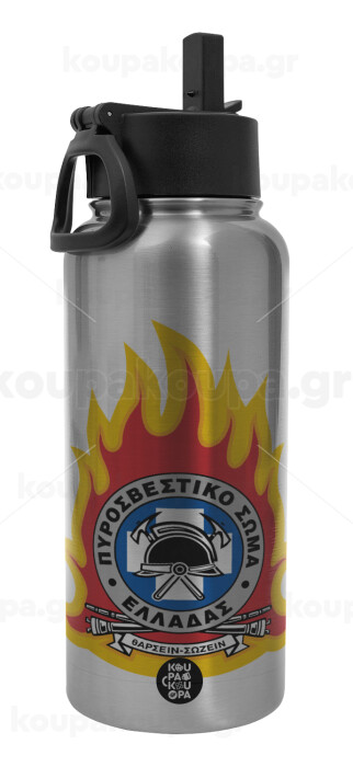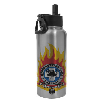Πυροσβεστικό σώμα Ελλάδος σκούρο, Metal mug thermo Silver with Straw and Spout Lid (Stainless steel), double wall, 950ml