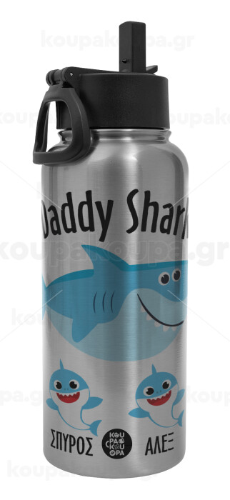 Daddy Shark (με ονόματα παιδικά), Metal mug thermo Silver with Straw and Spout Lid (Stainless steel), double wall, 950ml